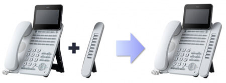 ボタン増設アダプタを接続することにより、電話機はそのままにファンクションボタンを増設することができるので、オフィスを拡張する際にも柔軟に対応できます。
