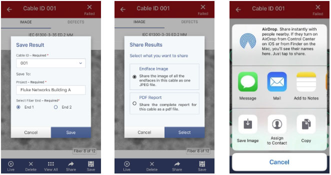 小規模なジョブや簡単な検査を行う場合は、Wi-Fiを介してFI-3000をiOSまたはAndroid機器に接続することもできます。FiberInspectorアプリ(FI-IN)を使うと、合否結果を簡単に確認できるだけでなく、FI-3000をコントロールして、ライブ・ビューで各端面を拡大/縮小したり、端面全体を横移動表示したりすることができます。またFI-INでは、結果に名前を付けて機器に保存したり、画像やPDFレポートをチームに送信して、素早く簡単に共同作業を行えます。