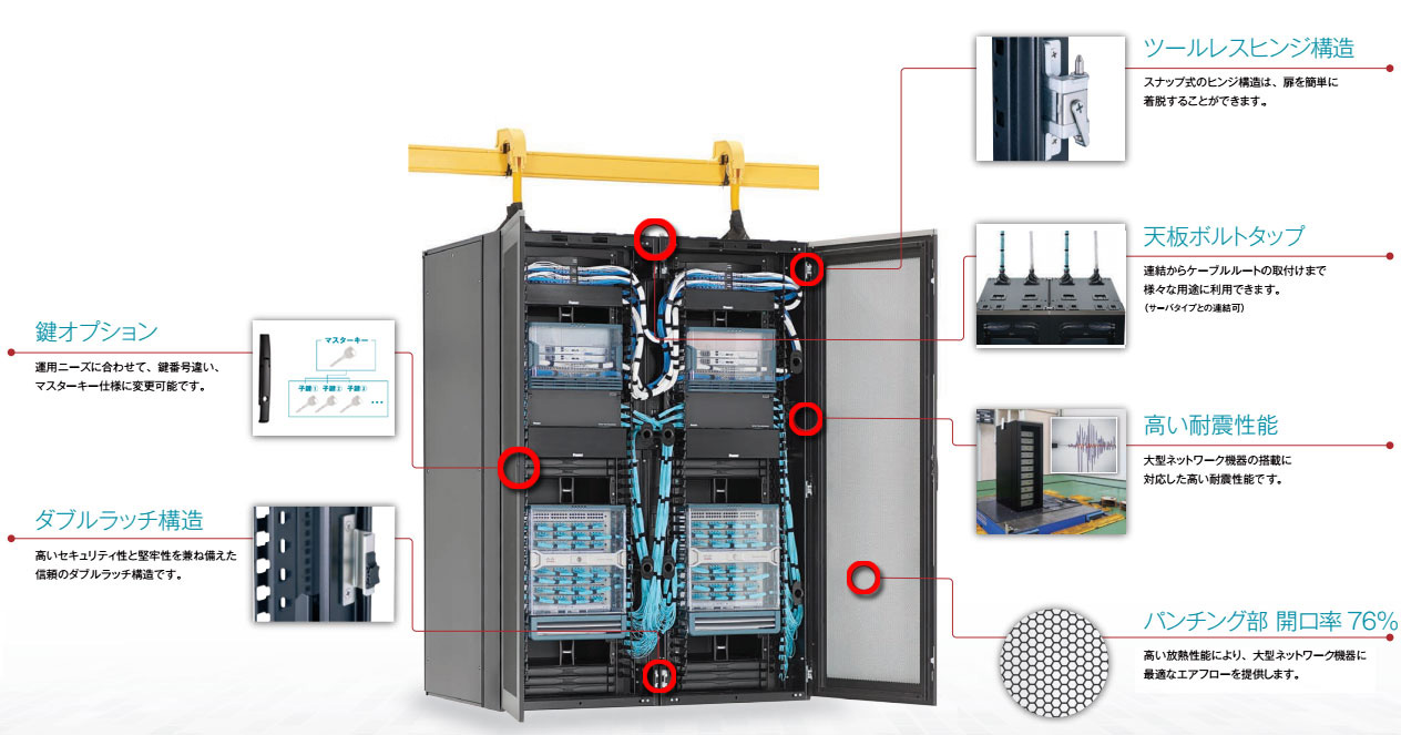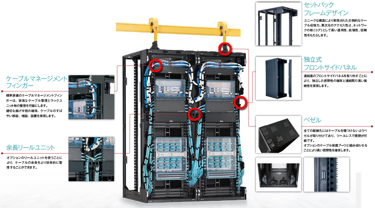 セットバックフレーム構造は、大量のケーブルを効率的に管理することができ、ほかに類を見ないアクセススペースが運用の効率を向上させます。