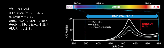 ブルーライトカットLS1200-U2 が発している光の中で、最もエネルギーの強い波長(450nm 付近の青色光)を最大約50%カット*1します。 *1. EZSWITCH のカバーを取った状態からのカット率です。