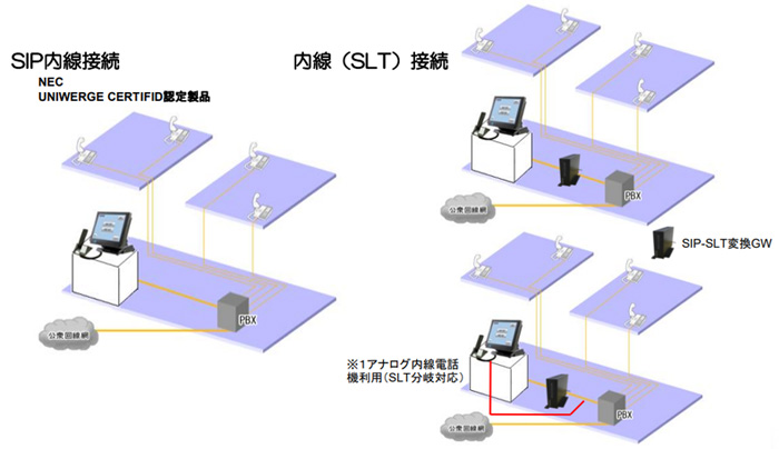 標準SIP端末を収容出来るPBXであれば、PBXのSIP端末として収容することが可能です。(日立HTDN、NEC UNIVERGE CERTIFIED取得)