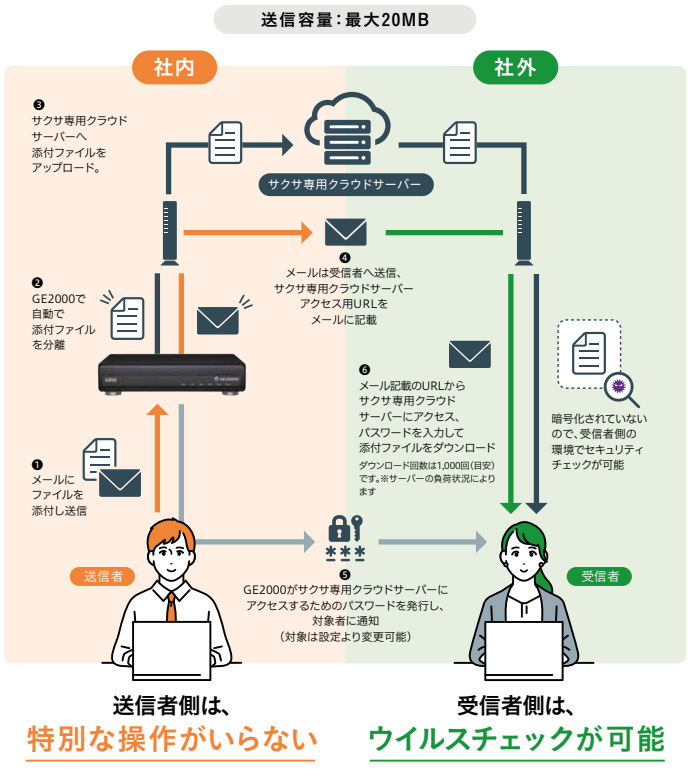 受信者は、サクサ専用クラウドサーバーから添付ファイルをダウンロードします。