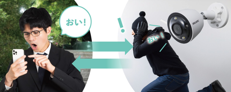 マイクとスピーカーを内蔵していますので集音、遠隔操作でアラート音、声掛けが可能ですので不審者を威嚇できます。