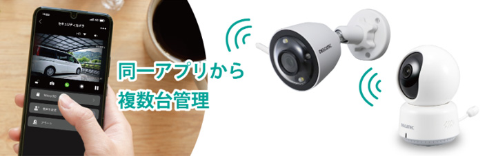 本製品専用アプリを使用すれば、今回発売いたします「ワイヤレスカメラ」のほかに専用アプリ対象製品も合わせて接続でき、同一アプリ内で一元管理を実現。お家の中から外まで一括でホームセキュリティを実現。