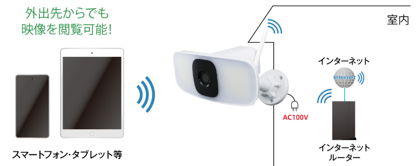 ・スマートフォンやタブレットの専用アプリ(みまもるeye)で外出先から映像確認可能