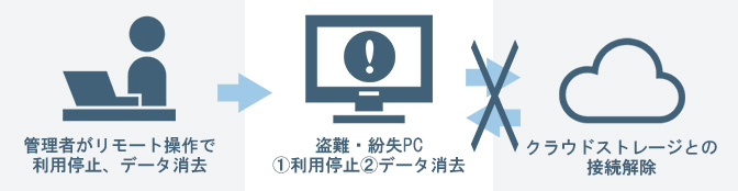 万が一の紛失・盗難が発生した場合でも、管理画面から当該PCの利用を停止するだけで、クラウド上のデータへのアクセスを遮断できます。
