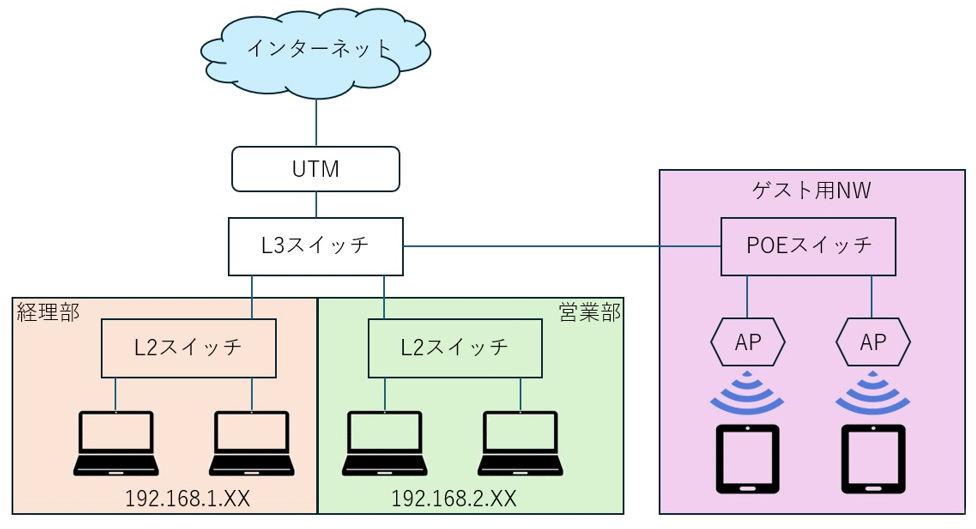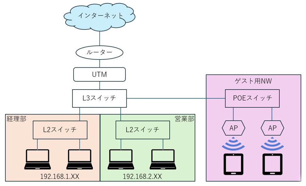 基本的には最小構成を大元として、「人数が○○名」「部署ごとにネットワークを別ける」「ゲスト用に無線を使えるように」などの要件に合わせて肉付けしていくこととなります。