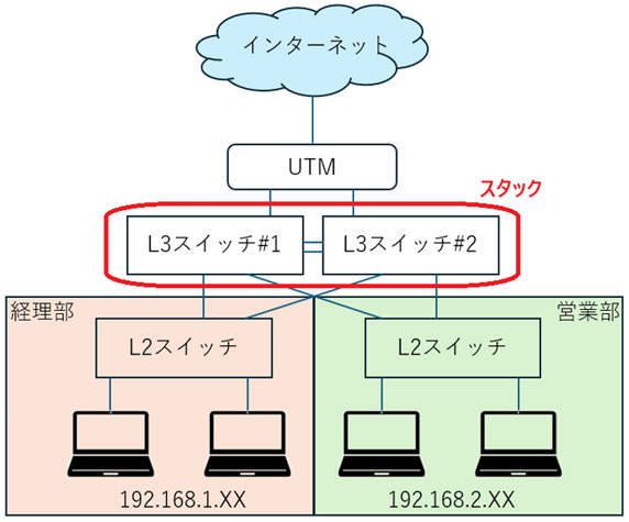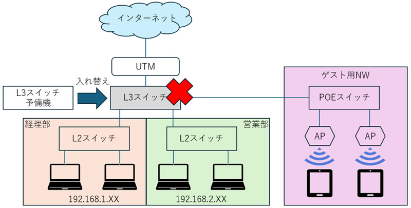 上の”ネットワーク 構成例”において、AP以外のネットワーク機器(UTM、L3スイッチ、経理部L2スイッチ、営業部L2スイッチ、AP用POEスイッチ)がシングルポイント(単一障害点)となっています。