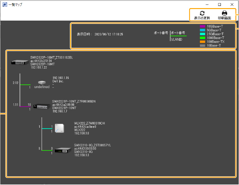 ネットワーク図を紙で管理している企業もまだまだ多いですが・・・ネットワーク構成を変更した場合も「Whole map」ボタンクリック1発で最新のネットワーク状態を取得でき、現場のシステム管理担当者の負担を大幅に軽減できます。