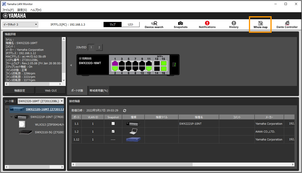 ヤマハのネットワーク機器だけではなく、同じネットワークに繋がっているパソコンやAV機器など末端のIT機器までメーカー問わず接続状況を自動表示。