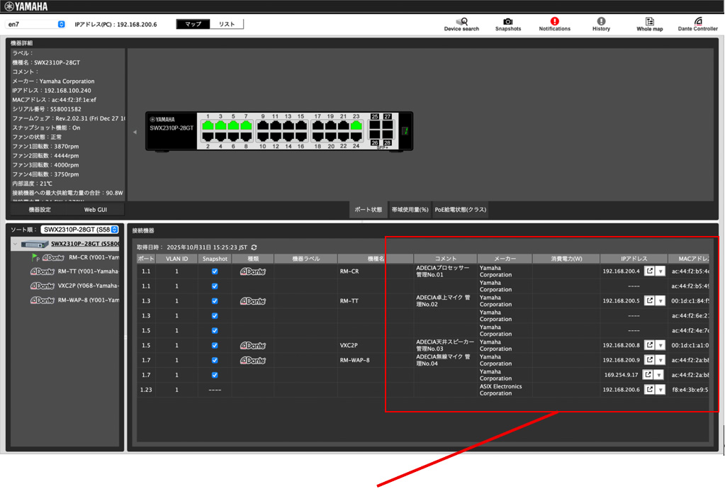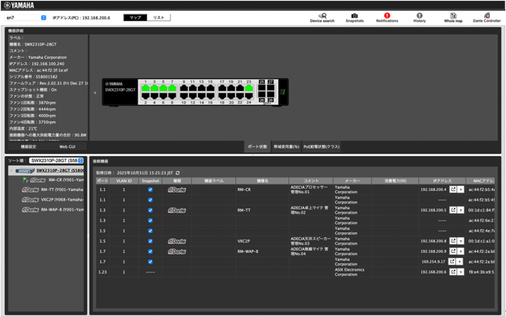 たとえば複数のADECIA機器がネットワーク接続されている場合、マイクやスピーカーのIPアドレスやスイッチの接続ポート番号、PoE給電量は不足してないか、データ通信は問題ないか、といったネットワーク経路や通信状態を「見える化」で簡単に把握できるため、映像・音響システム全体の安定運用もYamaha LAN Monitorが支援します。
