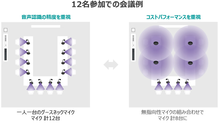 音声認識精度を重視したい、発言の多い方にはグースネックマイクを、事務局やあまり発言しない方にはテーブルトップマイクを組み合わせるなど、コストパフォーマンスを重視した用途に応じた柔軟な運用も可能です。
